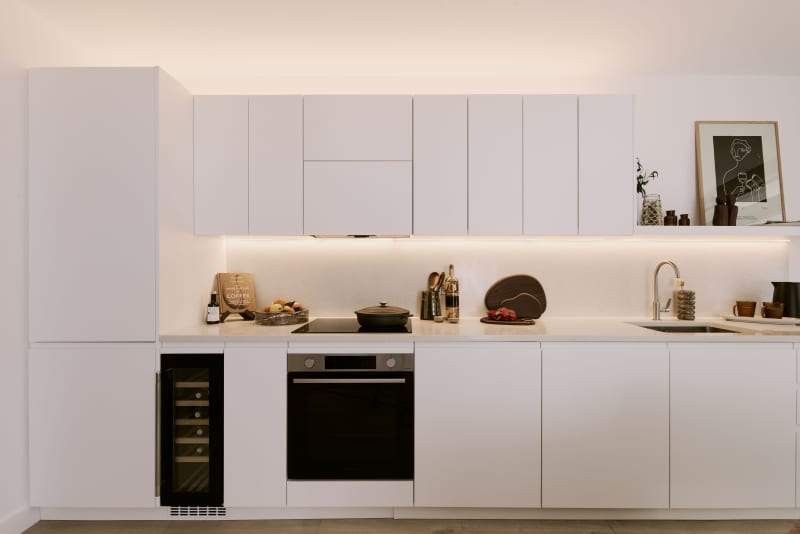 Tranquil and inviting, the two bedroom rental apartments at Alma are your sanctuary in the heart of London. The thoughtfully designed kitchen, living and dining space opens onto your own private terrace or winter garden. The spacious master bedroom features a king size ottoman bed and generous built-in storage. The two luxurious bathrooms feature walk-in rainfall showers, baths, heated floors and towel rails. Completing the space are a second double bedroom, utility space and clever storage.