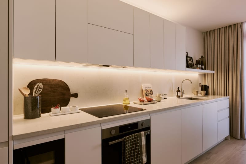 Alma's three bedroom rental apartments are central London living at its best. The living space is thoughtfully planned with kitchen, living and dining space opening onto your own private terrace or winter garden. The spacious ensuite master bedroom featuring a king-sized bed and generous built-in wardrobes. The two further bedrooms feature one king-size and one double ottoman bed, again with built-in wardrobes. Bathrooms are luxurious with both bath and rainfall shower, heated floor and towel rails.